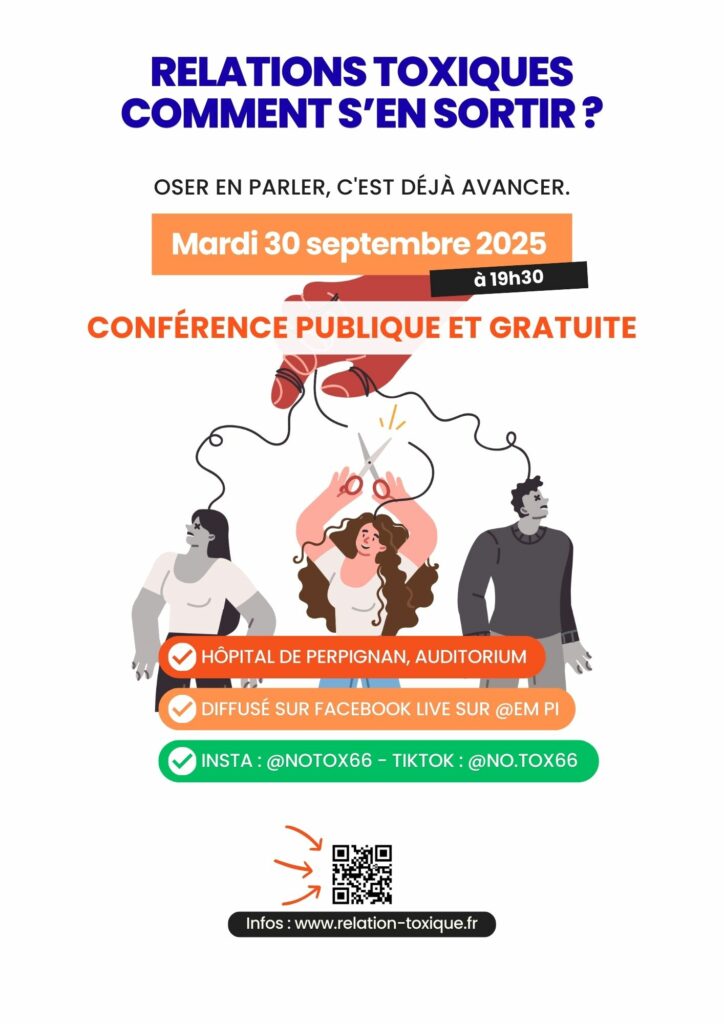Relations toxiques : comment s'en sortir ! Conférence Notox avec 3 professionnels, le mardi 30 septembre 2025 à 19h30 à l'Hôpital de Perpignan dans l'auditorium
